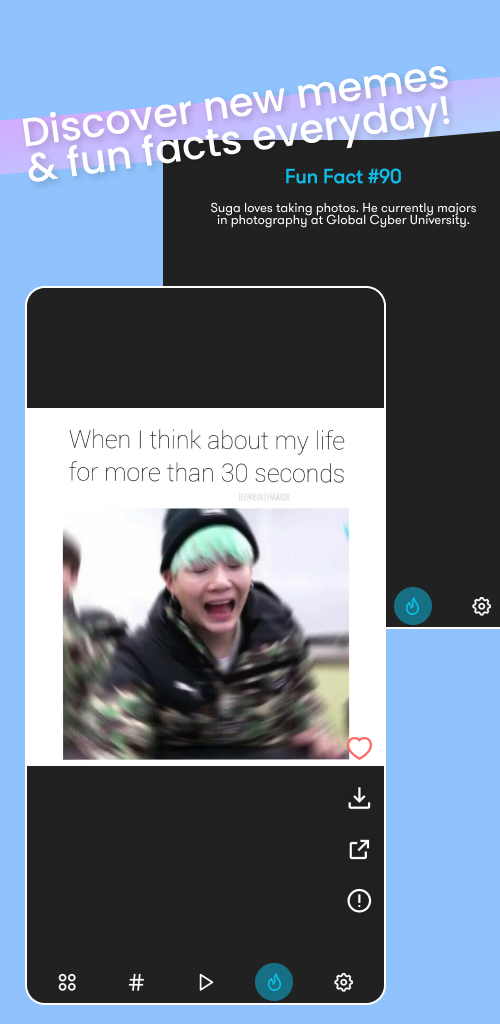 If you're a fan of BTS's Suga and want access to a wide range of high-quality wallpapers, entertaining videos, funny memes, and interesting facts all in one place, then this app is perfect for you. With a user-friendly interface, quick performance, and daily updates, you can enjoy all things Suga without any hassle. Download now and dive into the world of Suga with this amazing app!